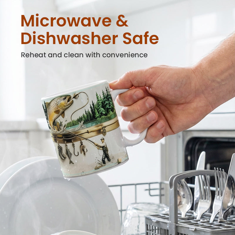 ODOLNÁ KERAMICKÁ KONŠTRUKCIA: Tento hrnček je vyrobený z vysoko kvalitnej keramiky a je navrhnutý tak, aby vydržal. Dobrze udržuje teplo a udrží vašu kávu alebo čaj teplé, zatiaľ čo vy spomínate na svoje najväčšie úlovky a plánujete ďalší výlet.