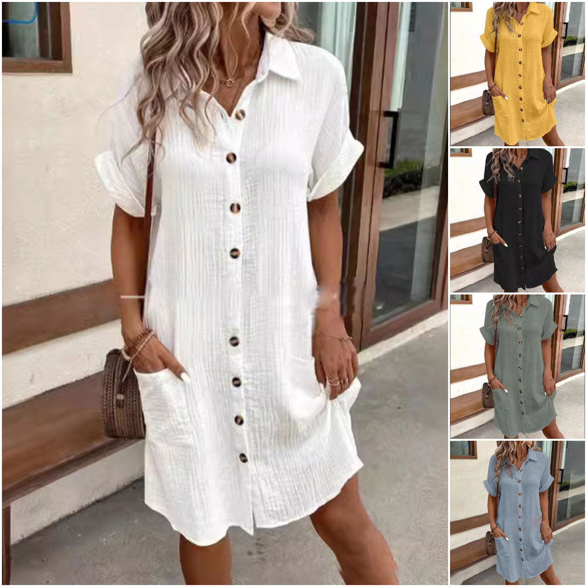 1*Dámske košeľové šaty s krátkym rukávom s gombíkmi a vreckami na voľný čas