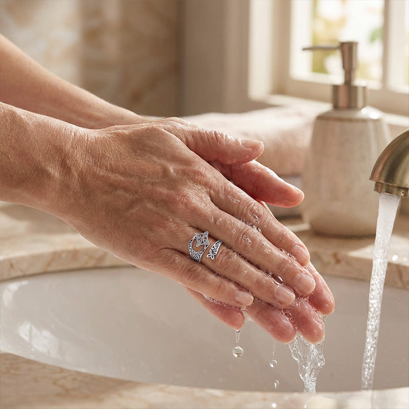 Aby si prsteň zachoval svoj lesk, vyhnite sa kontaktu s agresívnymi chemikáliami, ako sú parfémy, krémy a chlór.
