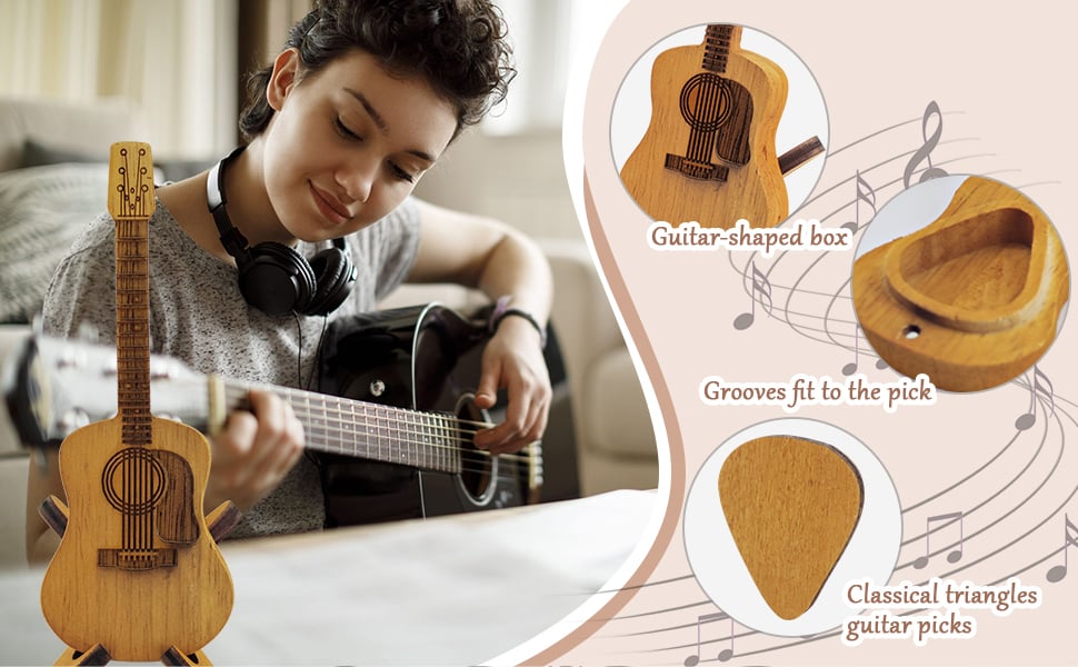 Drevená krabička na akustickú gitaru pojme tri drevené trsátka.